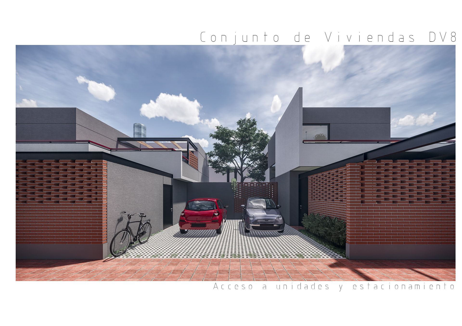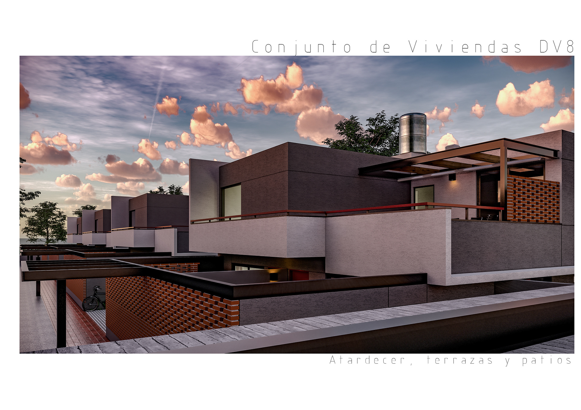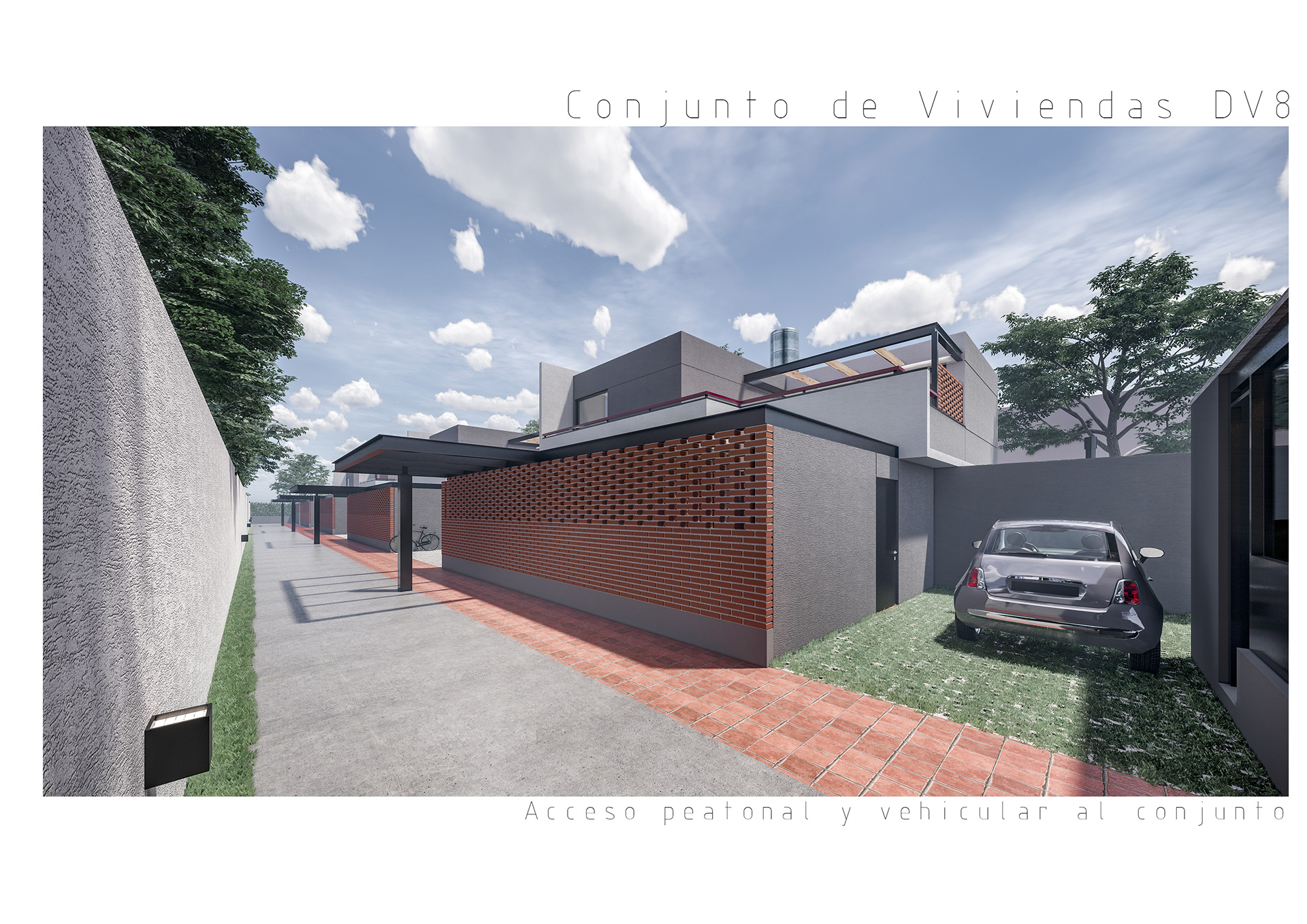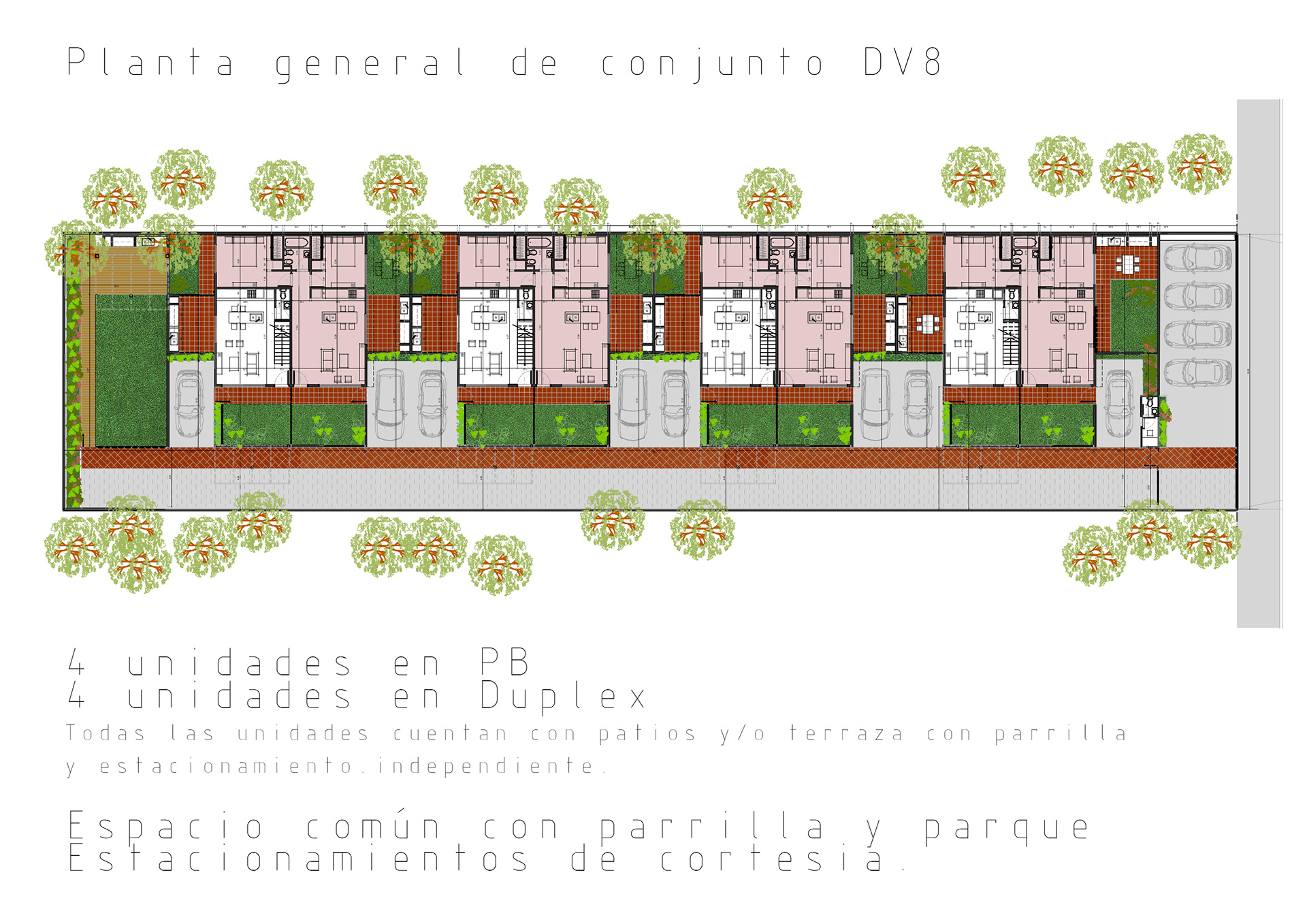 Conjunto de 8 casas en duplex de 3 hambientes con cochera, patios/terraza y parrilla individuales.